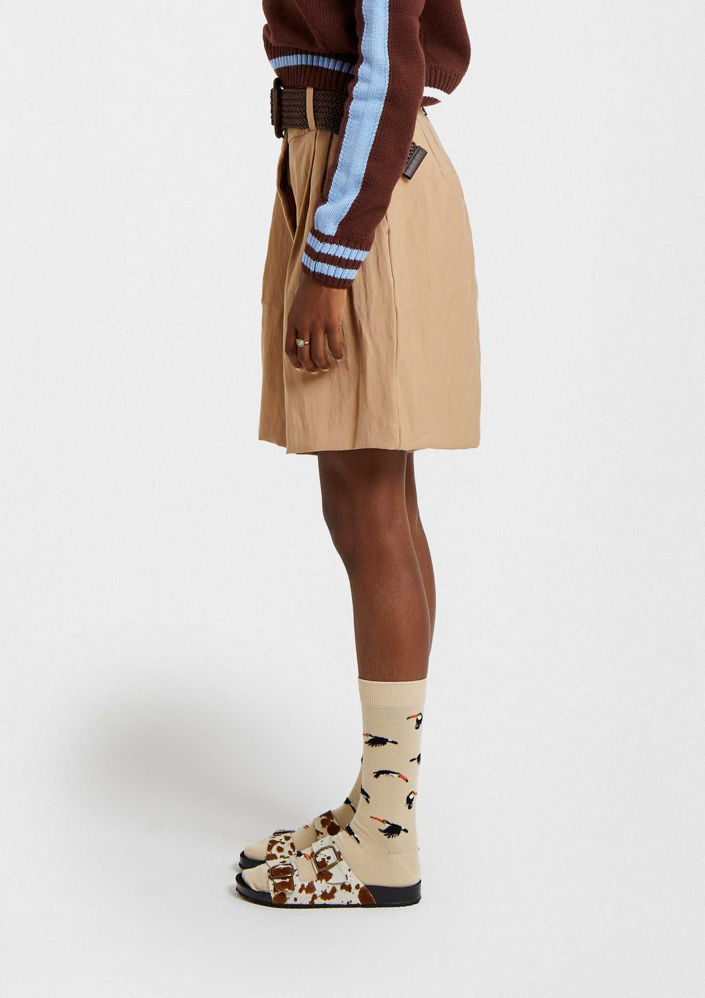 Beige socks with toucan patterns.