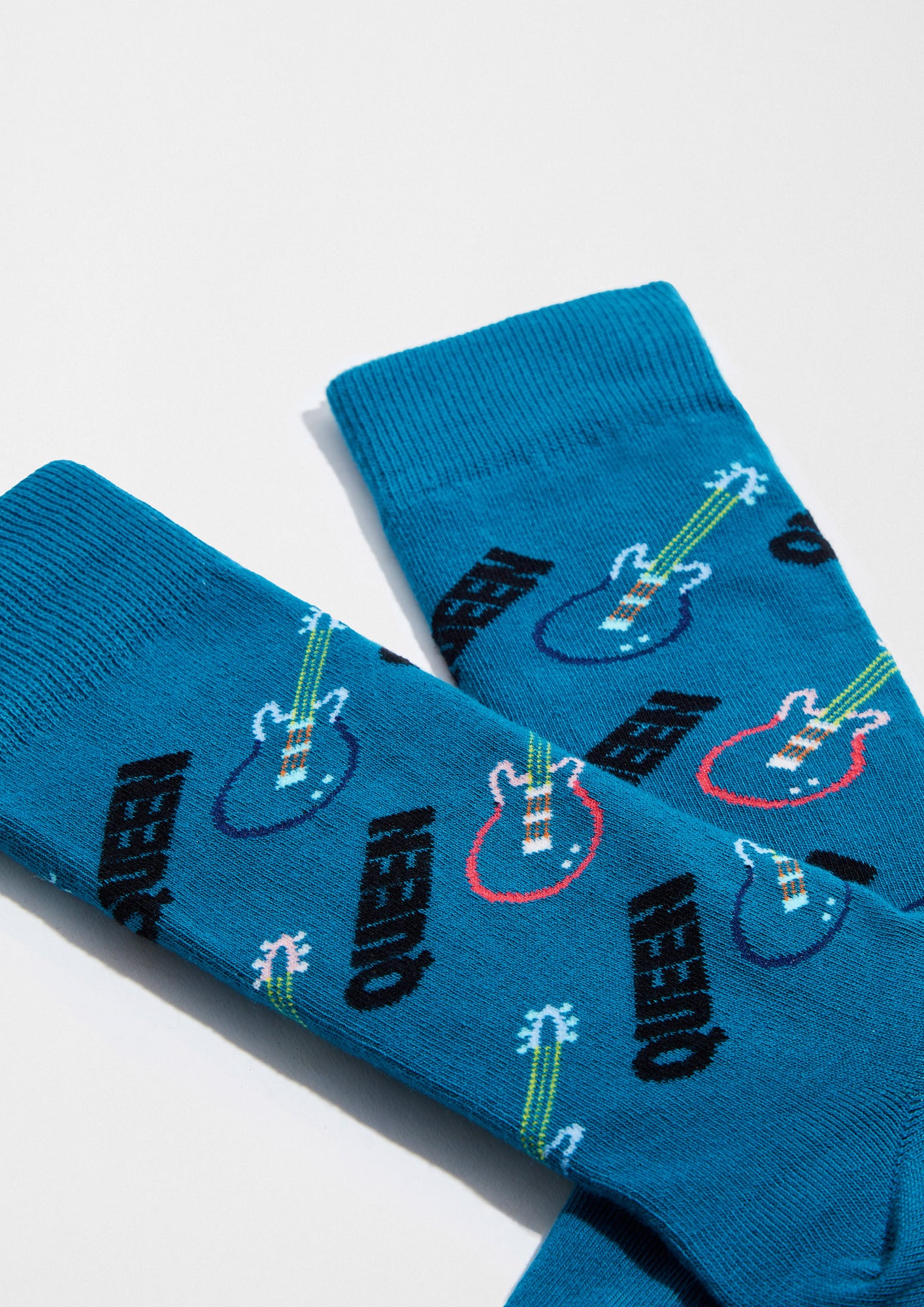 Los calcetines originales BeQueen Guitarr presentan una base azul petróleo sobre la que se distribuye un patrón de guitarras eléctricas en colores contrastados intercalado con el nombre de la banda. El diseño combina el imaginario visual de Queen con una estética pop actualizada al Zeitgeist de la moda actual.
