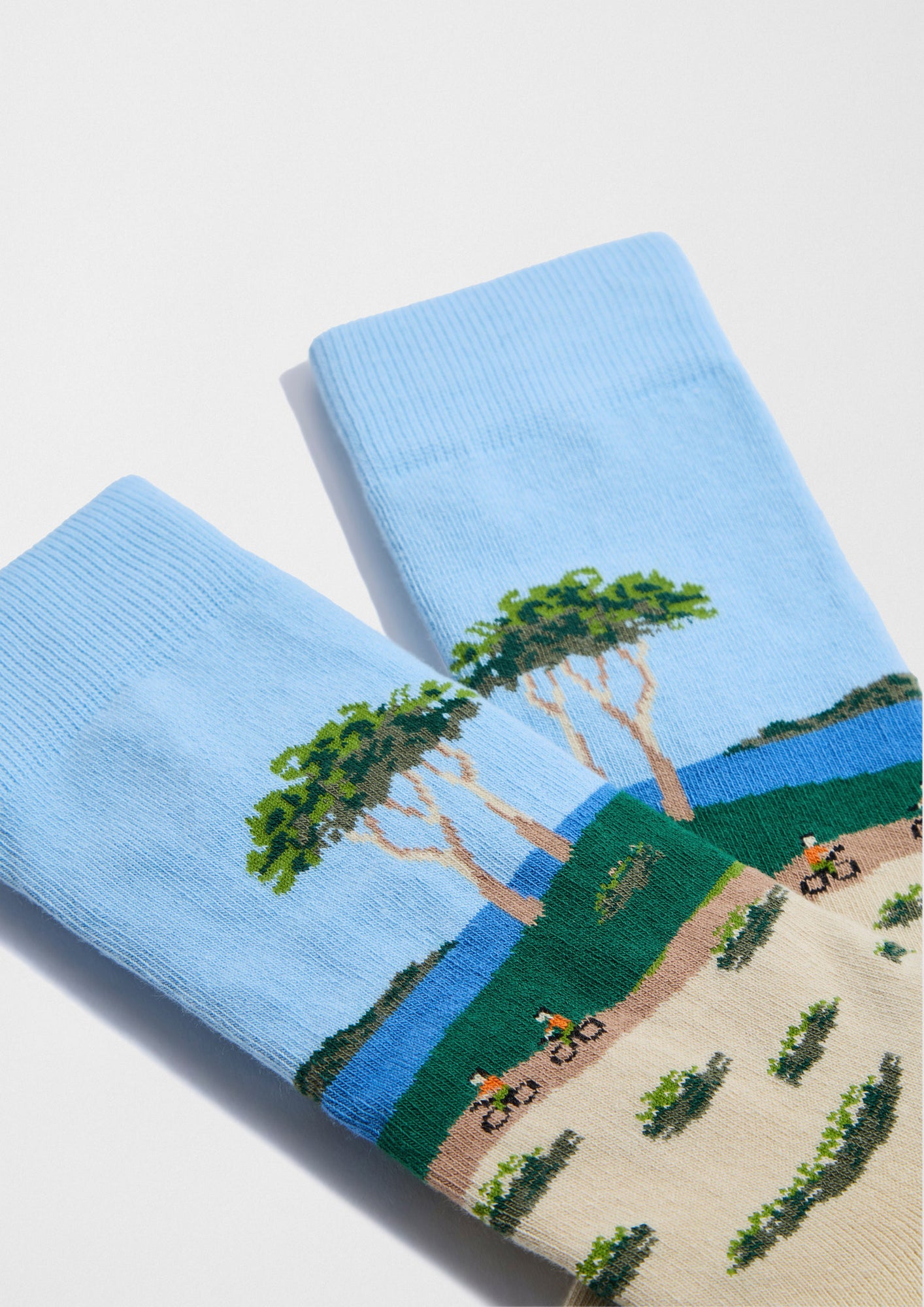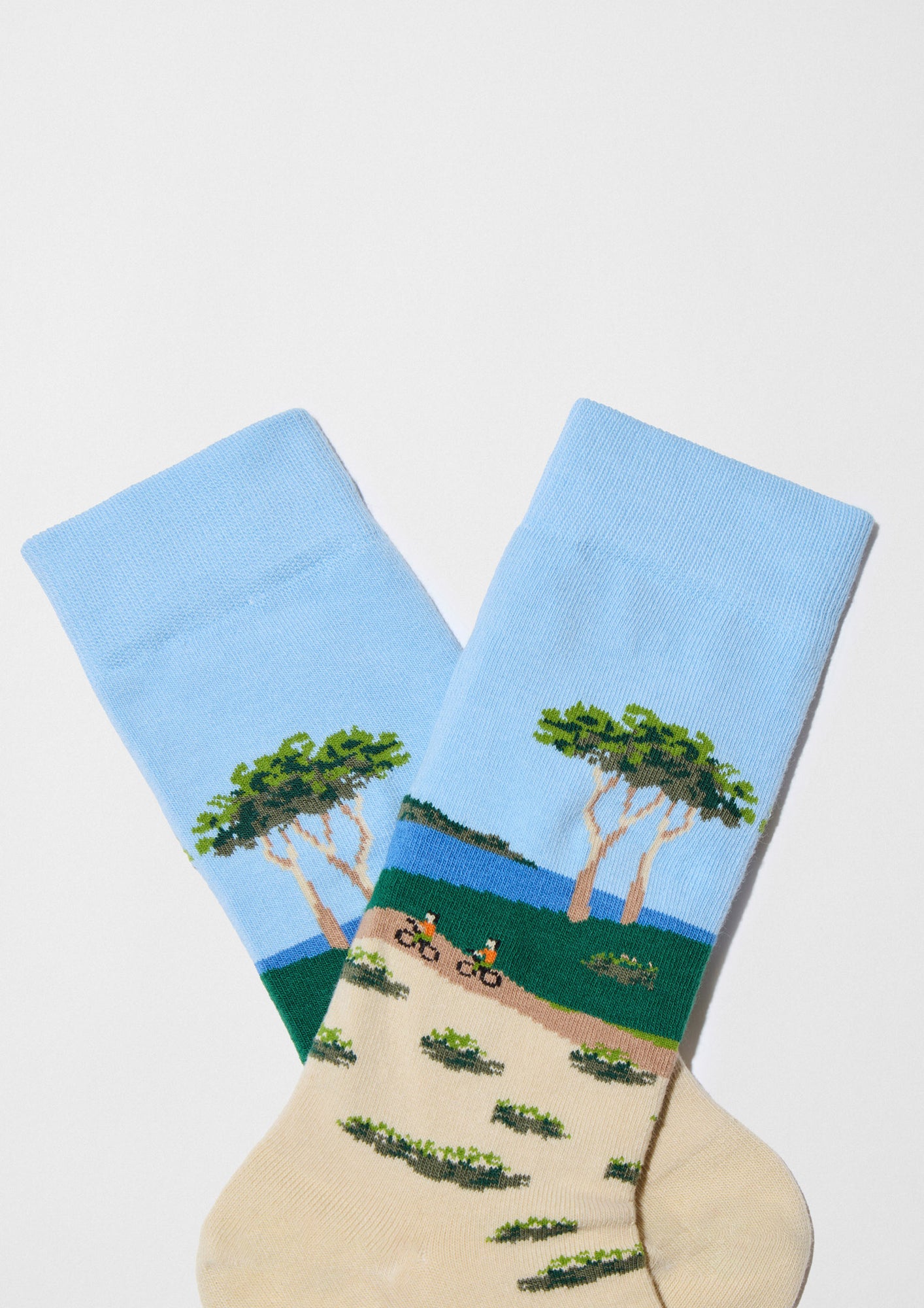 Los calcetines BeLandscape presentan un diseño panorámico sobre una base de tonos arena y azul que representa una escena de ciclismo en un entorno natural. El motivo se extiende de forma continua a lo largo de la caña. El talón, la puntera y el puño mantienen el mismo tono del fondo.