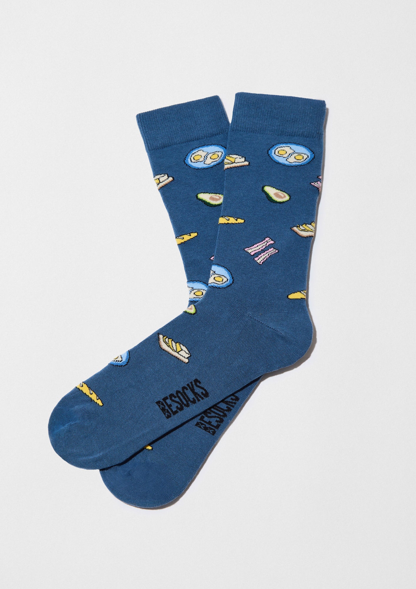 Los calcetines BeBrunch Blue presentan una base de color azul con un patrón de alimentos asociados al brunch. El diseño se repite de forma uniforme a lo largo de toda la prenda. El talón, la puntera y el puño mantienen el mismo tono del fondo. Un modelo adecuado para looks casuales e informales.