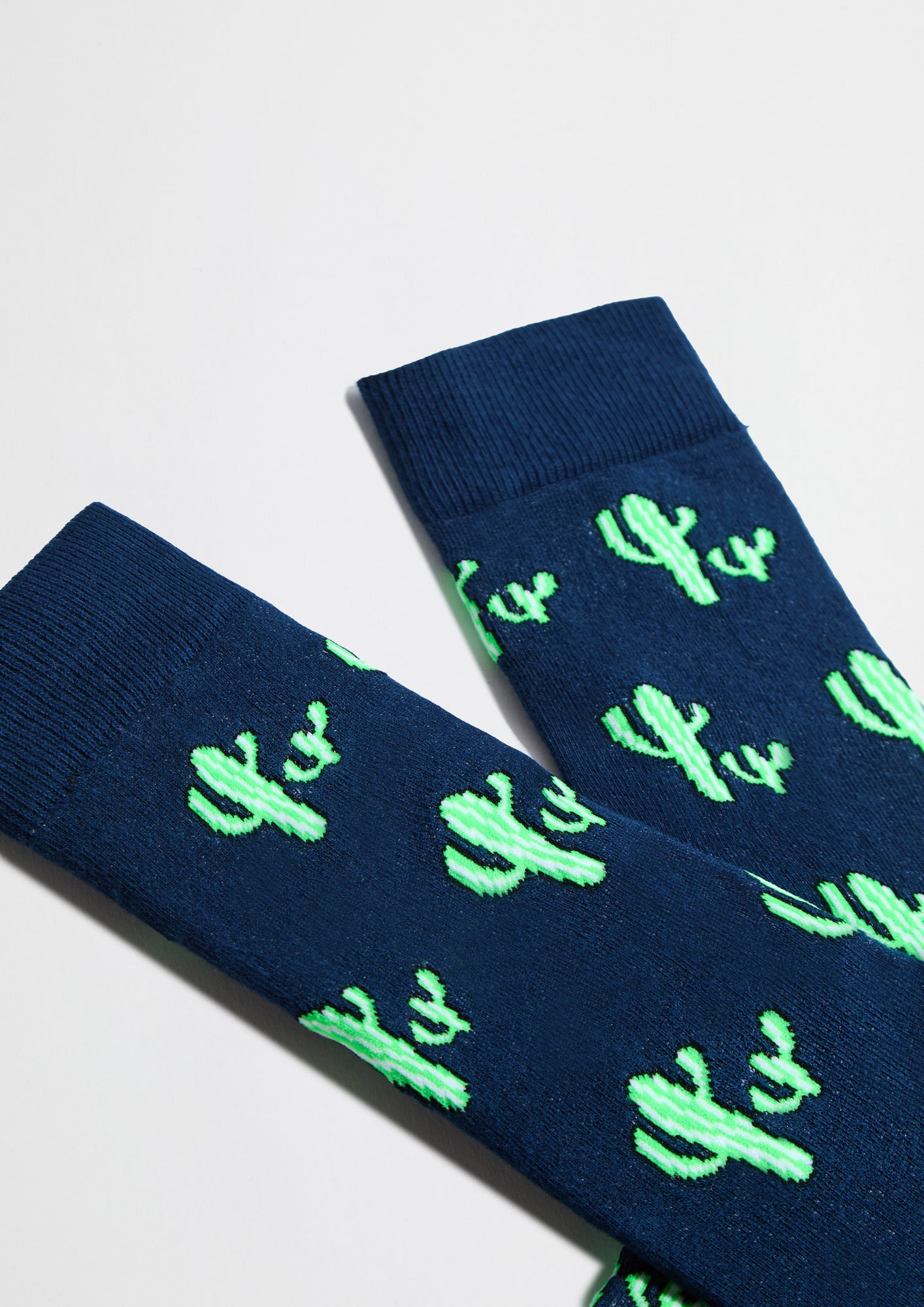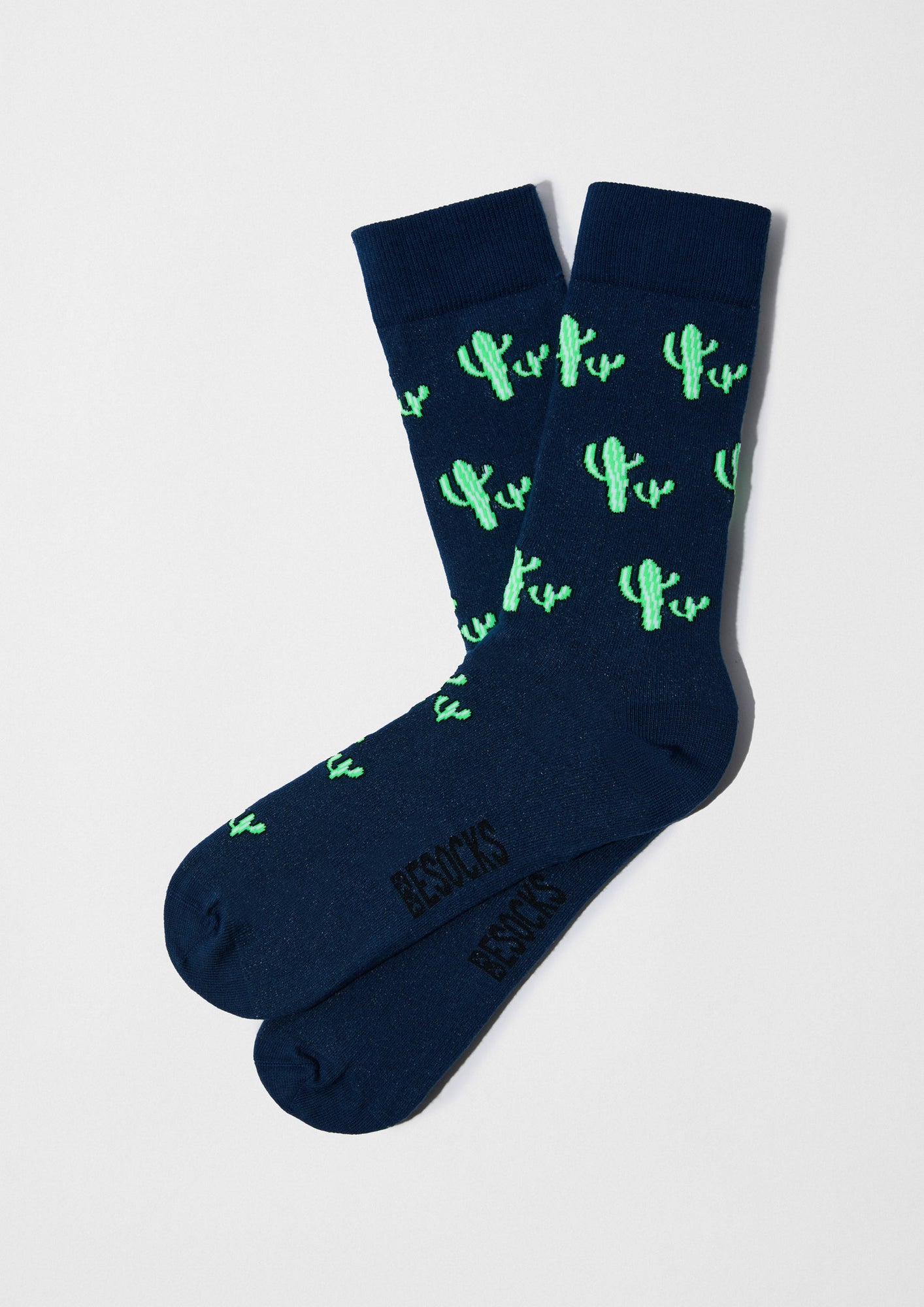 Los calcetines BeCactus Navy presentan una base de azul marino con un patrón repetido de cactus de color verde flúor distribuidos de forma uniforme a lo largo de toda la prenda. El diseño cubre toda la superficie del calcetín. El talón, la puntera y el puño mantienen el mismo tono del fondo. Un diseño equilibrado que fusiona color con el estilo casual contemporáneo.