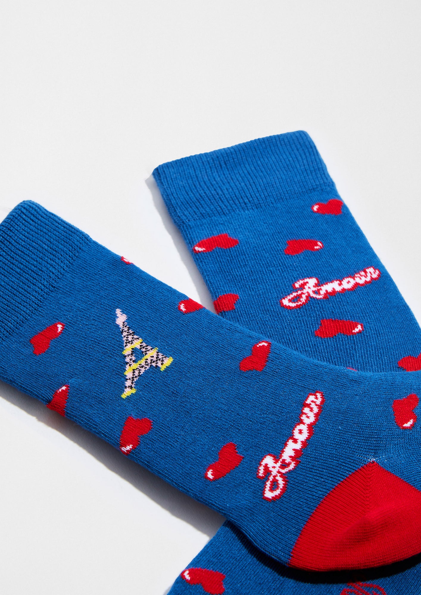 Los calcetines originales para mujer BeEmilyinParis Amour presentan un diseño en azul intenso con patrón de corazones rojos, tipografía bordada de la palabra “Amour” y siluetas de la Torre Eiffel. La puntera y el talón se rematan en rojo, generando contraste visual con la base y el resto del diseño.