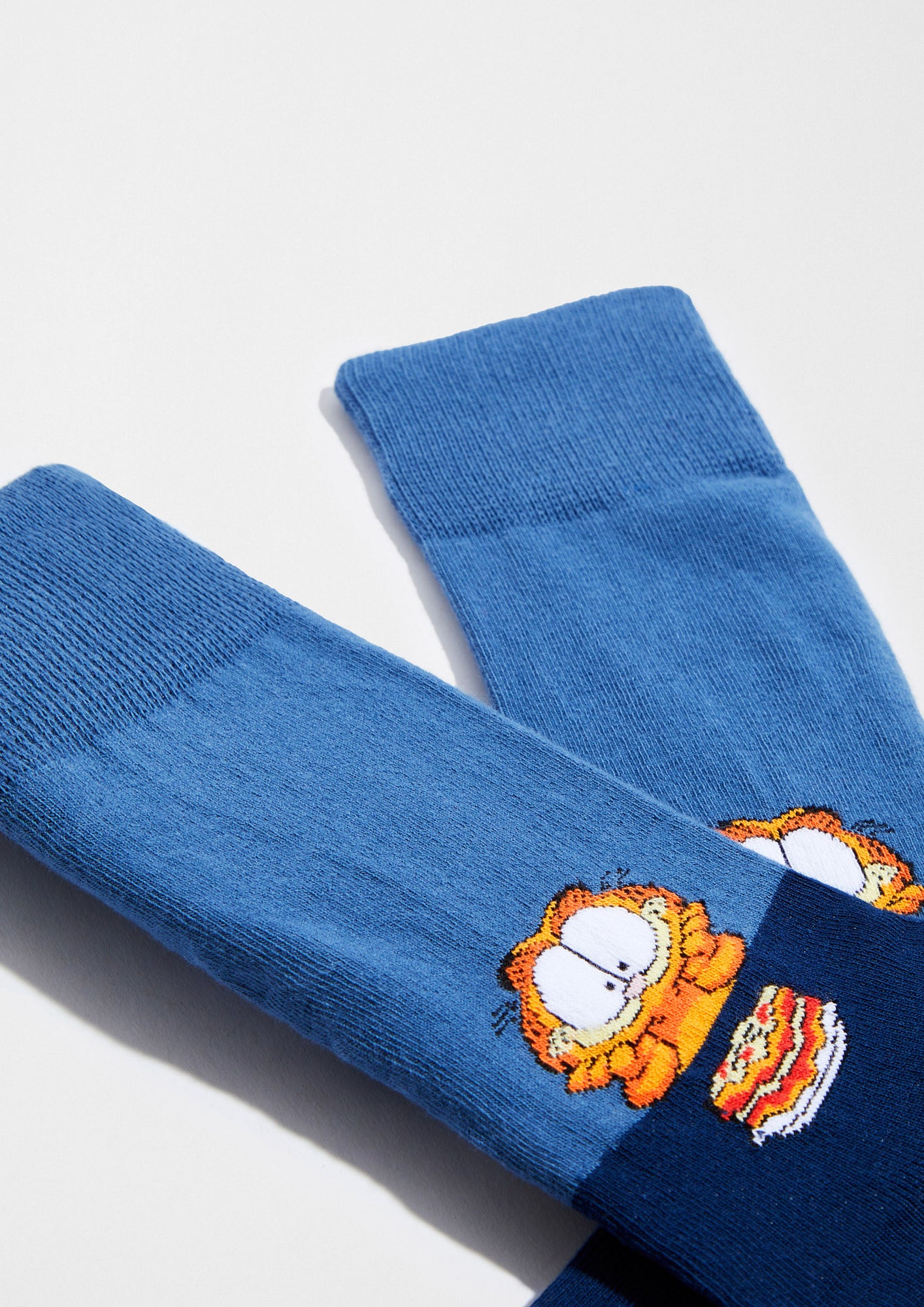 Los calcetines originales BeGarfield Lasagna combinan dos tonos de azul en con un diseño color block. El dibujo de Garfield sentado sobre una lasaña en sus característicos tonos naranja, se sitúa sobre la intersección que separa los dos bloques de color a la altura del tobillo.