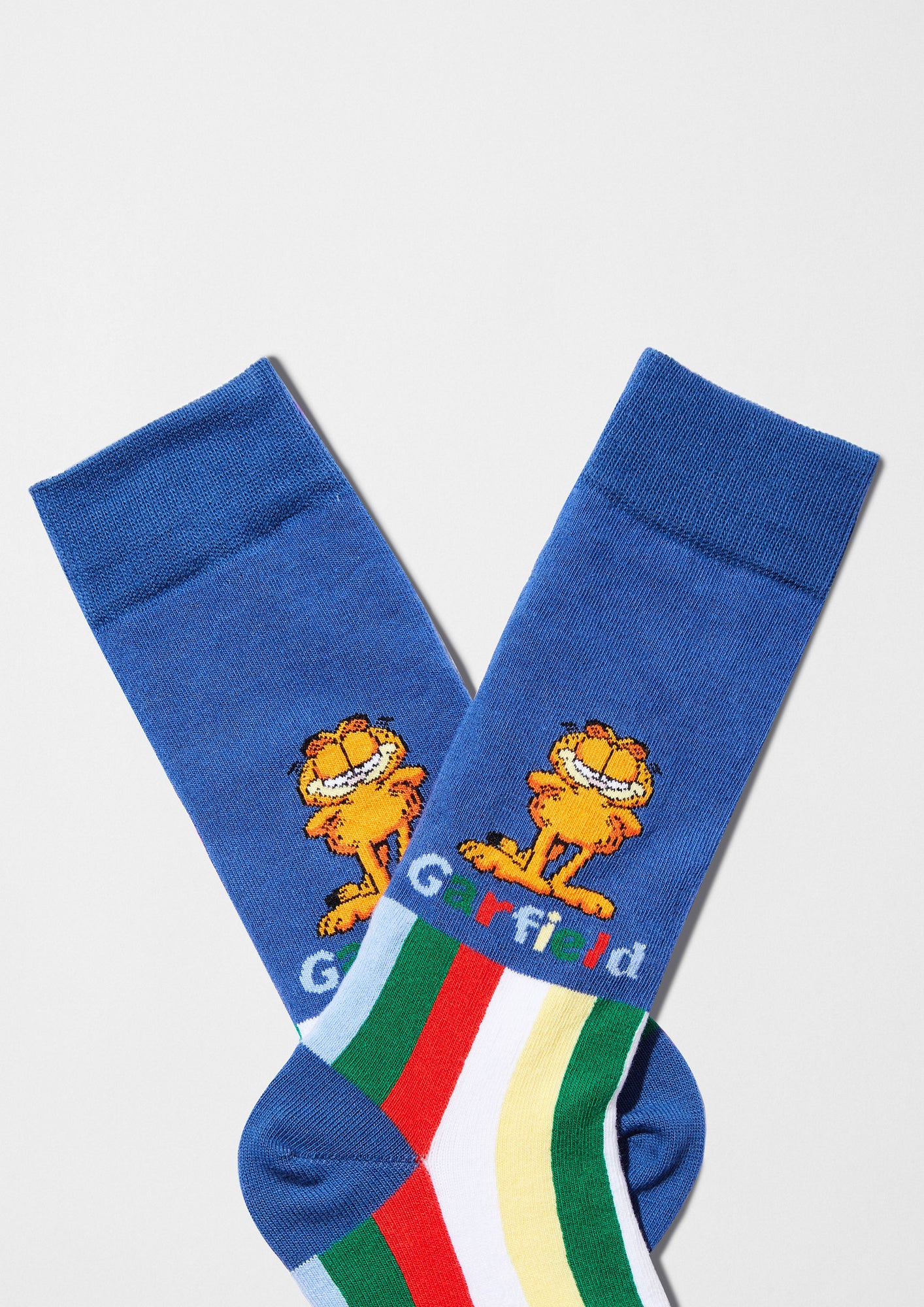 Los calcetines originales BeGarfield Stripes presentan un diseño en color block, con la parte de arriba en azul y la parte de abajo a franjas horizontales en rojo, amarillo, verde y azul claro, con el personaje de Garfield tejido en la parte frontal de la caña sobre fondo azul intenso. El logotipo aparece en la planta del pie y bajo el personaje.