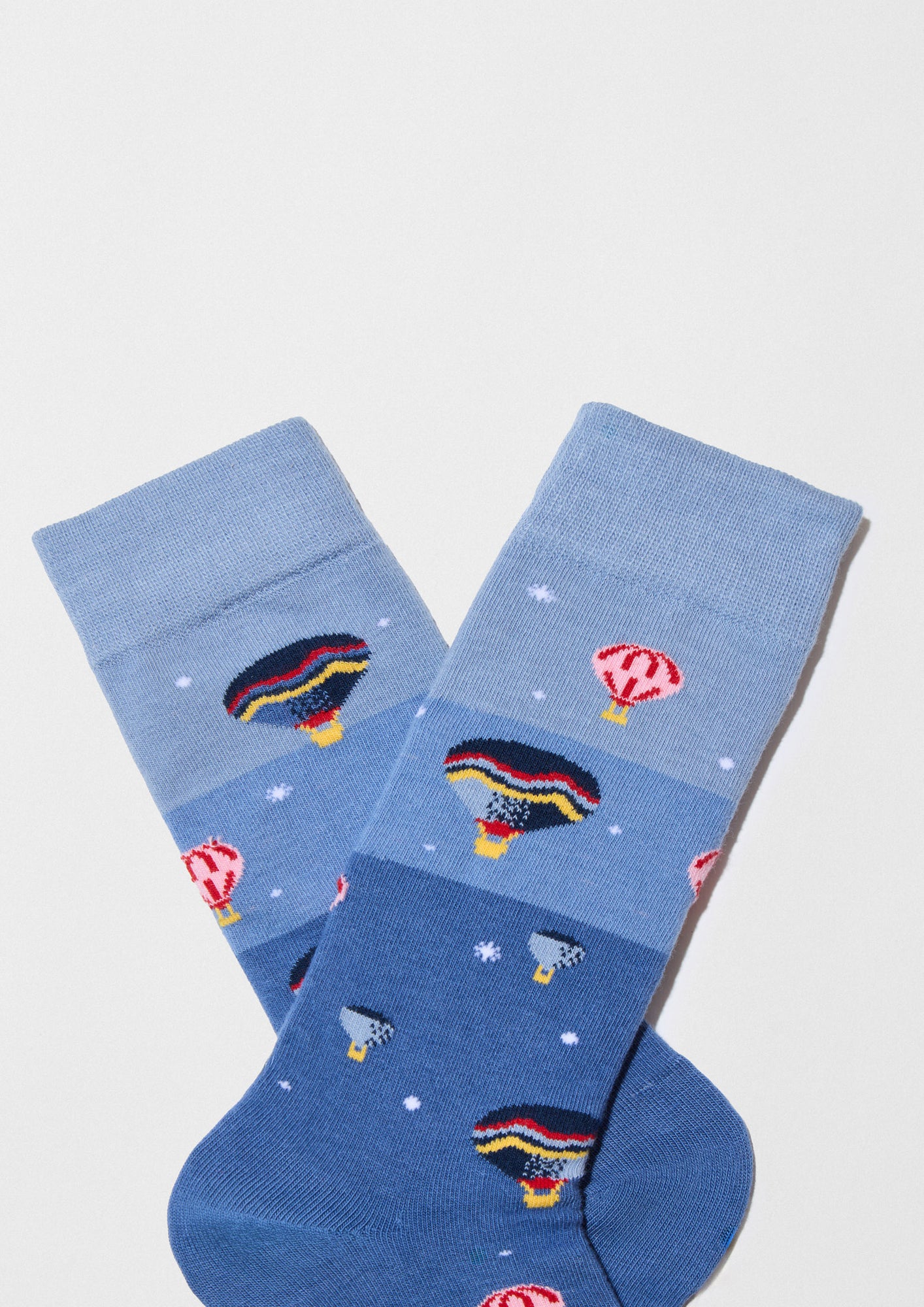 Los calcetines BeSkyJourney están confeccionados sobre una base de diferentes tonos de azul con un patrón repetido de globos aerostáticos y pequeños elementos gráficos distribuidos de forma uniforme. El diseño cubre toda la prenda. El talón, la puntera y el puño mantienen el mismo tono del fondo.