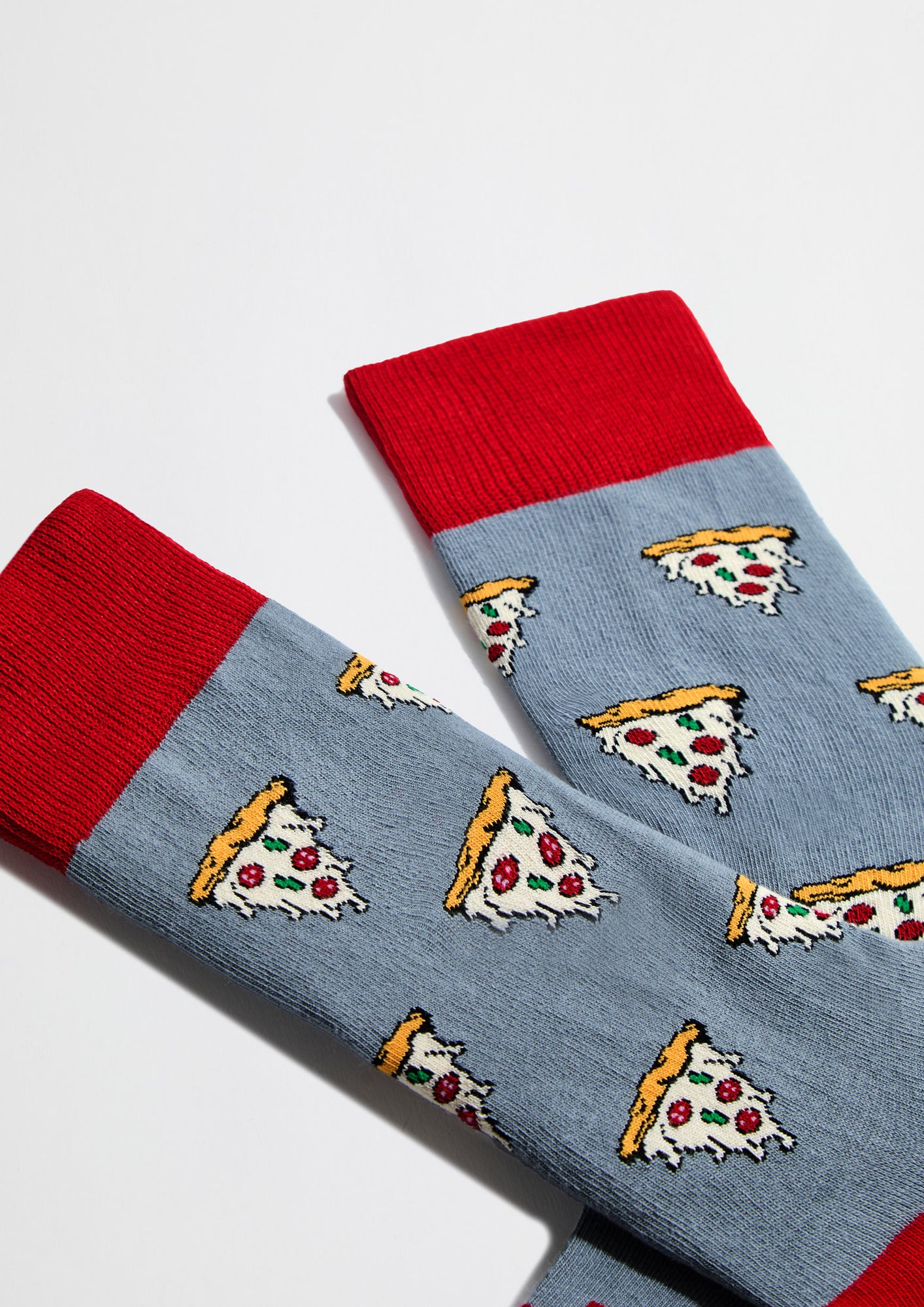Los calcetines BePizza presentan una base de color gris con un patrón repetido de porciones de pizza distribuidas de forma uniforme. El diseño cubre toda la superficie del calcetín. El talón y la puntera se presentan en color rojo, mientras que el puño mantiene el mismo tono del fondo. Fácil de integrar en looks casuales o relajados.
