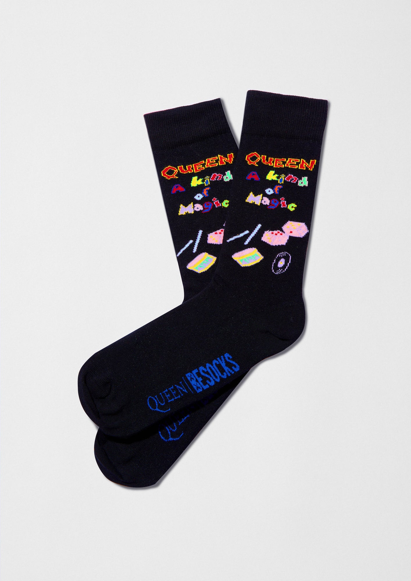 Los calcetines originales BeQueen Kind of Magic presentan un diseño gráfico multicolor con tipografía inspirada en el álbum “A Kind of Magic” de Queen. Están diseñados en color negro con ilustraciones de micrófonos, vinilos y elementos gráficos que evocan la estética del disco. La suela incorpora el logo Queen x BESOCKS en azul.