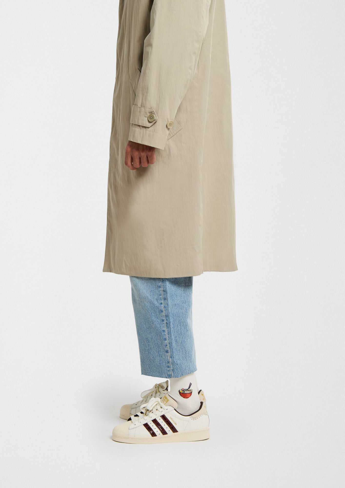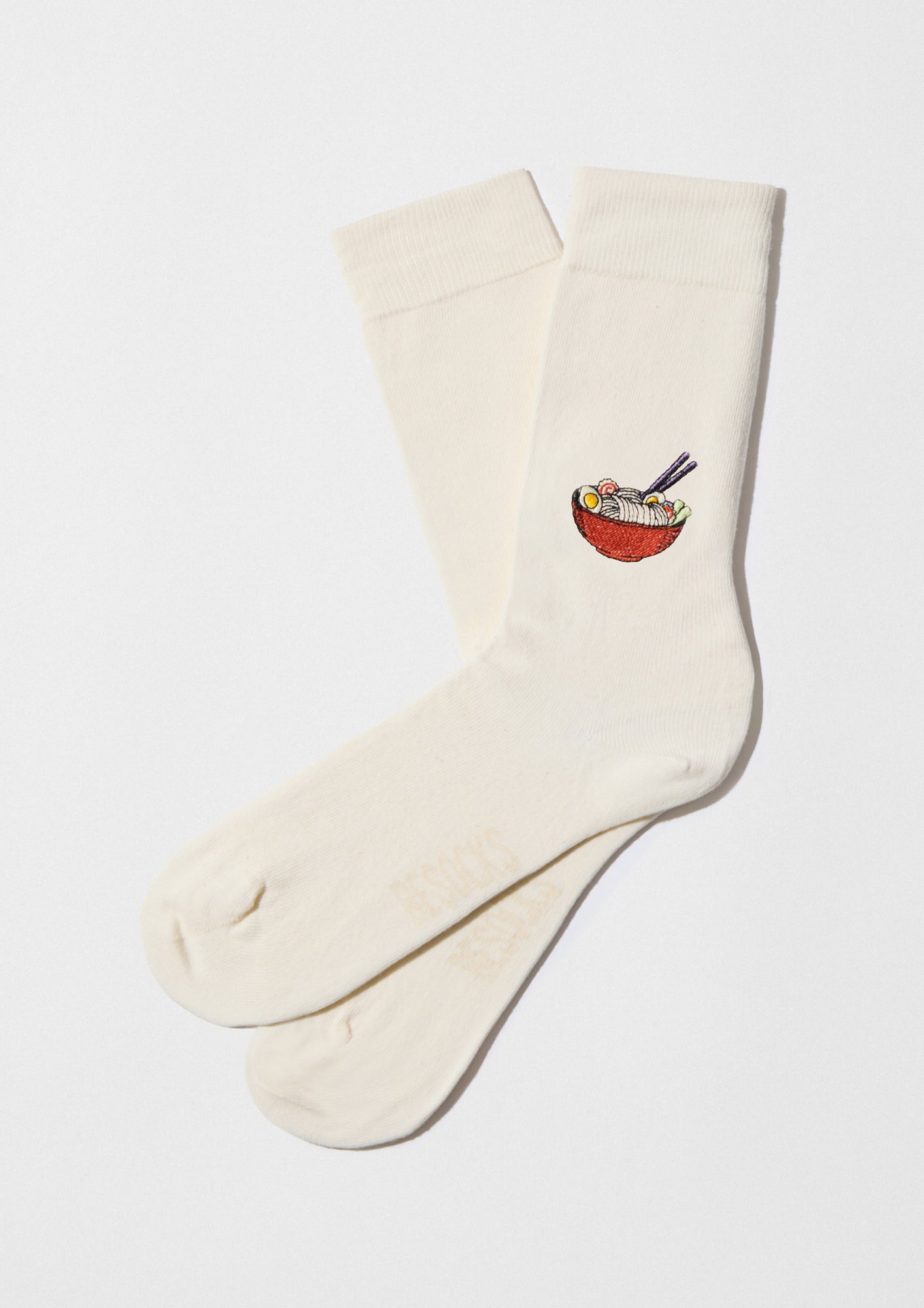 Los calcetines BeRamen Embroidered están confeccionados con un fondo beige con un bordado lateral de ramen. Un modelo vanguardista que puedes llevar con tus sneakers o zapatos favoritos.
