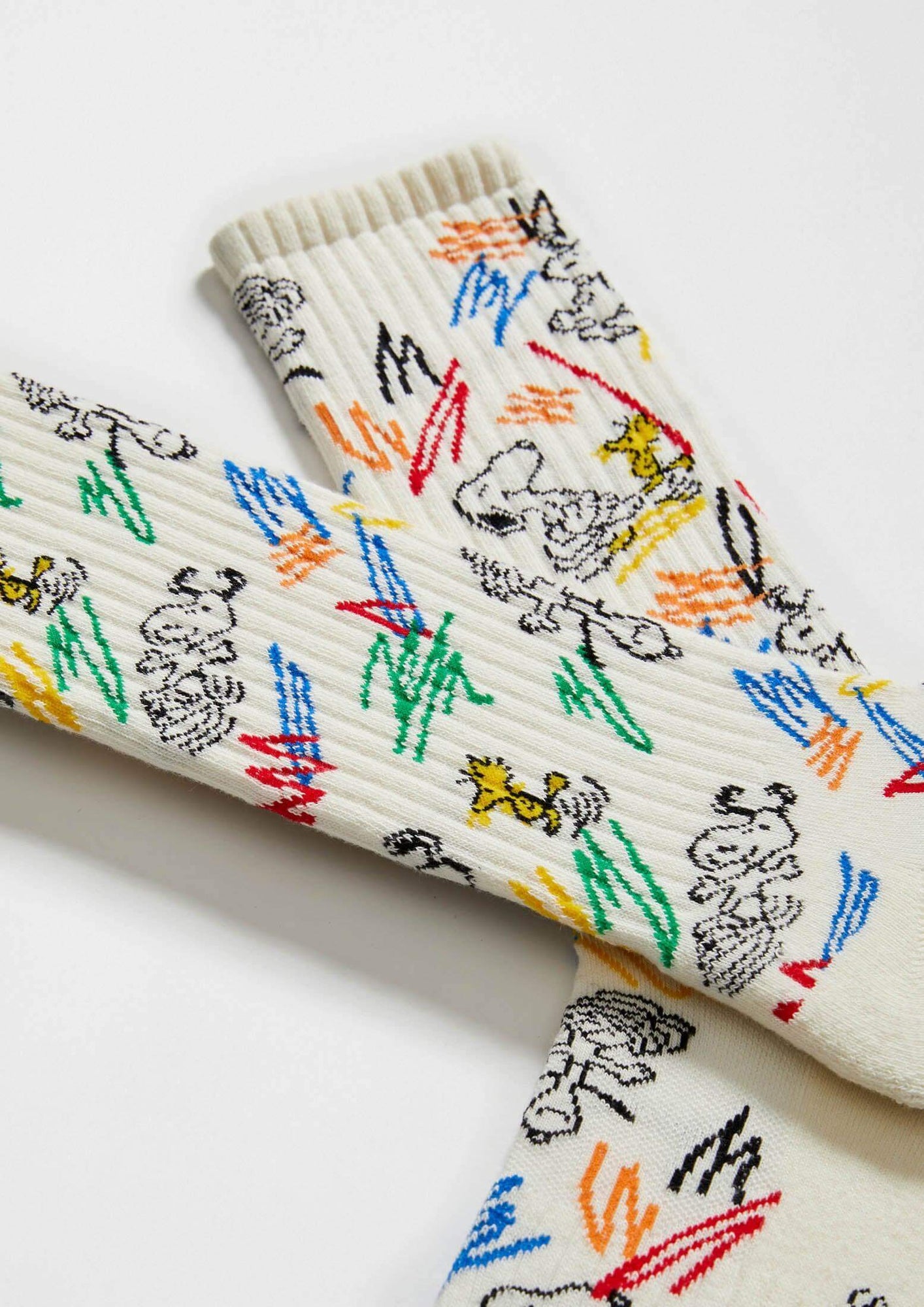 Los calcetines deportivos BeSnoopy Paint Beige están confeccionados en canalé sobre base beige, con ilustraciones repetidas de Snoopy y Woodstock acompañadas de trazos en colores llamativos. Tejido elástico confeccionado con algodón 100% orgánico