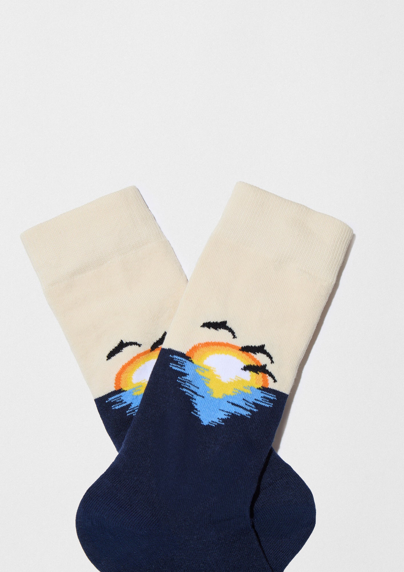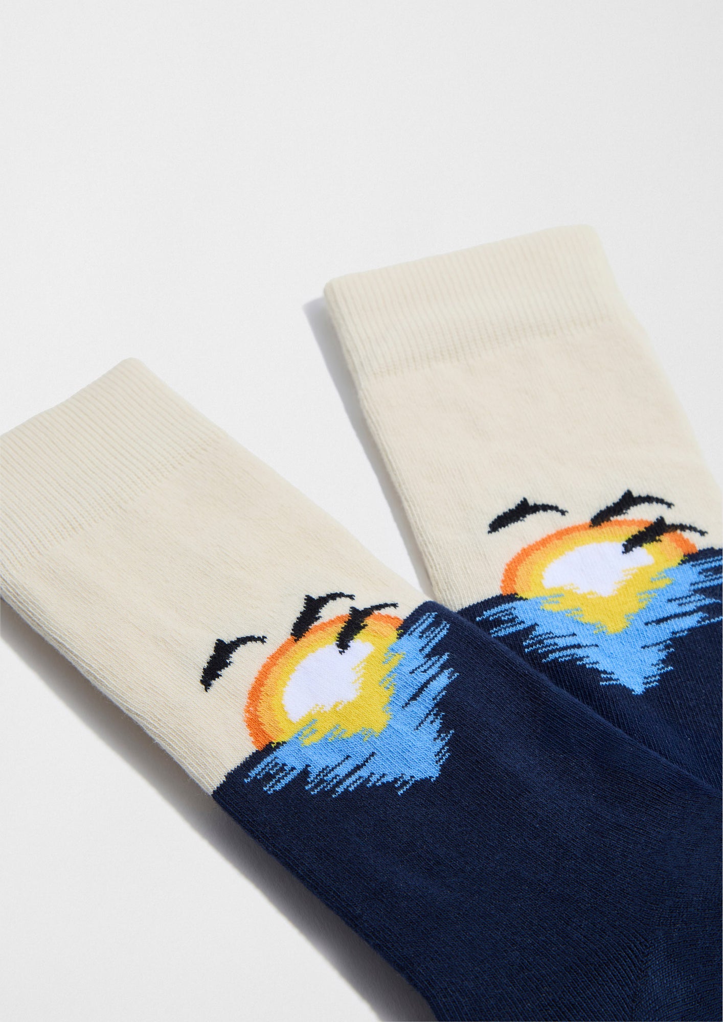 Calcetín beige y azul marino con dibujo de puesta de sol en el mar