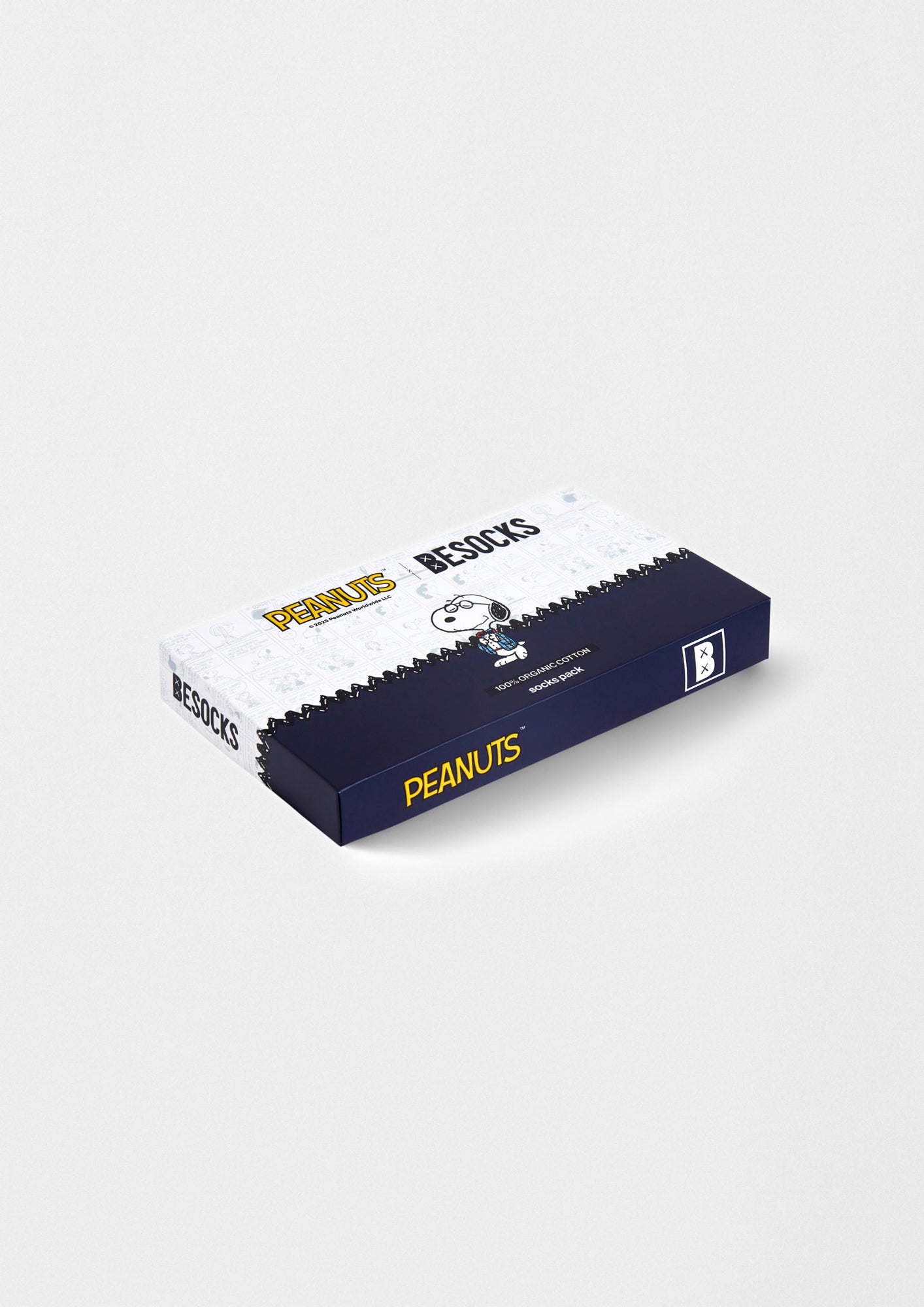 El pack Peanuts x BESOCKS incluye tres diseños originales confeccionados en algodón orgánico e inspirados en Snoopy, el mítico personaje de la tira cómica. Cada modelo representa un momento o estilo icónico de la colección casual. El set se presenta en una caja ilustrada con fondo blanco decorado con viñetas originales de Peanuts y una franja inferior azul marino donde destaca Snoopy vestido con su clásico look parisino.